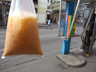 途中、屋台の紅茶屋さんを発見。アイスミルクティーを頼んでみたら、予想通り・砂糖ガバガバ・コンデンスミルク特盛んでもって、それをビニール袋へ! すごい、すごすぎる。けど、この甘さ・冷たさがタイには似合うぞぉ。普段は・紅茶もコーヒーもミルクも砂糖も入れない私だが、こいつはいけるぞっと。元気を取り戻し、怪しいビニール袋片手にカオサンへ |